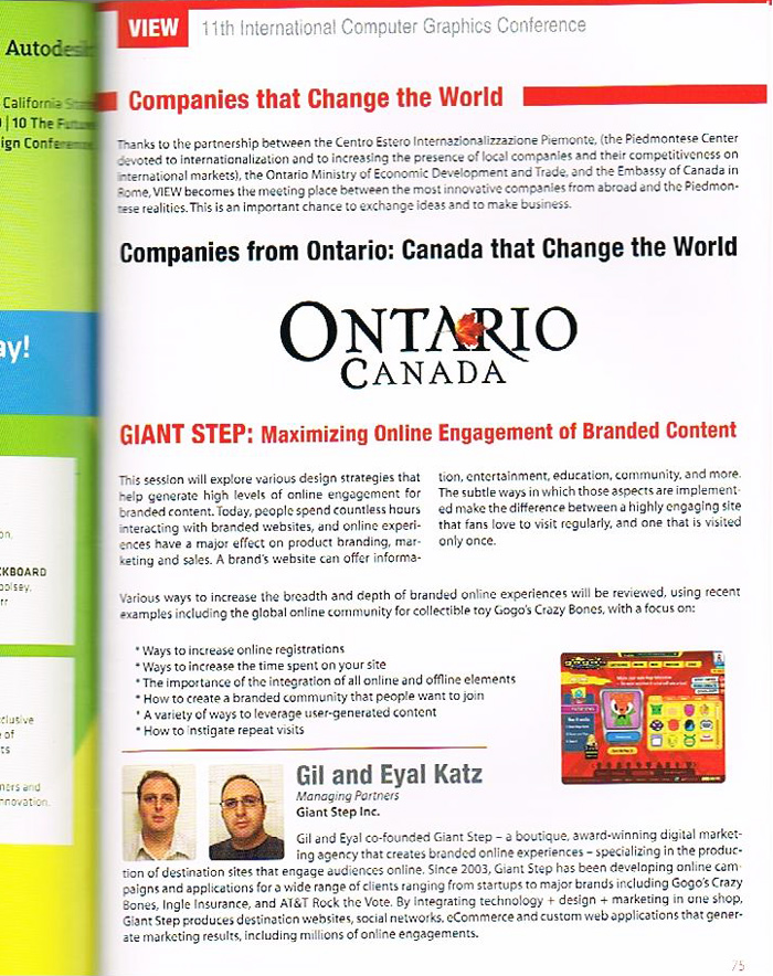 Giant Step presents at the 11th international View Conference for computer graphics in Italy. The presentation featured client work as well as the ‘Engagement Machine’ concept for digital marketing and ‘Digital Modules’ – tools for enabling the creation of a variety of user-generated content online.